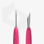 - Część robocza „kopytka skośnego” służy do podnoszenia i odciągania szorstkich i mocnych skórek, oczyszczania wolnych brzegów paznokcia, usuwania zacieków po lakierze żelowym.