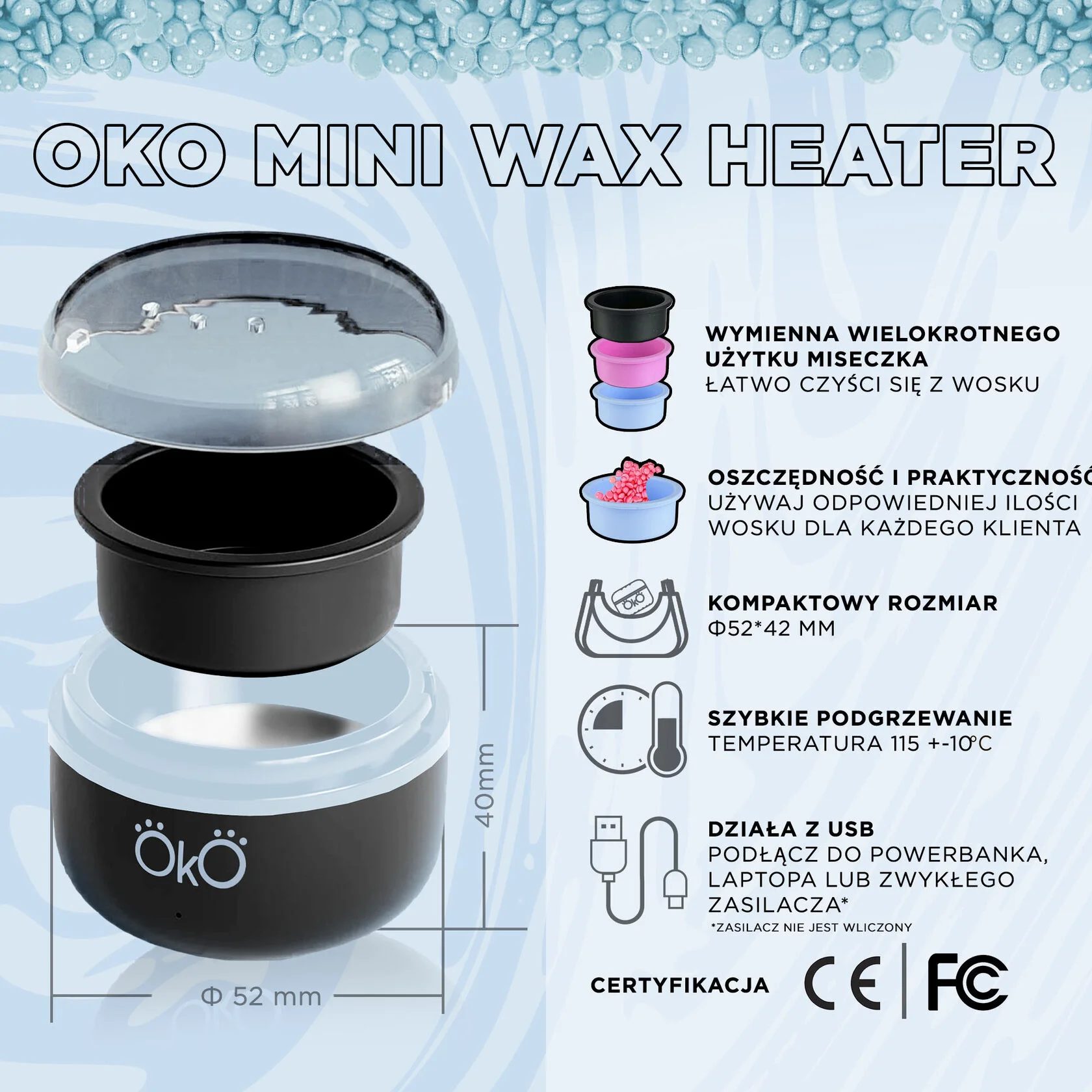 - Mały i kompaktowy rozmiar – podgrzewacz do wosku zajmuje minimalną przestrzeń i jest łatwy w transporcie w walizce roboczej.